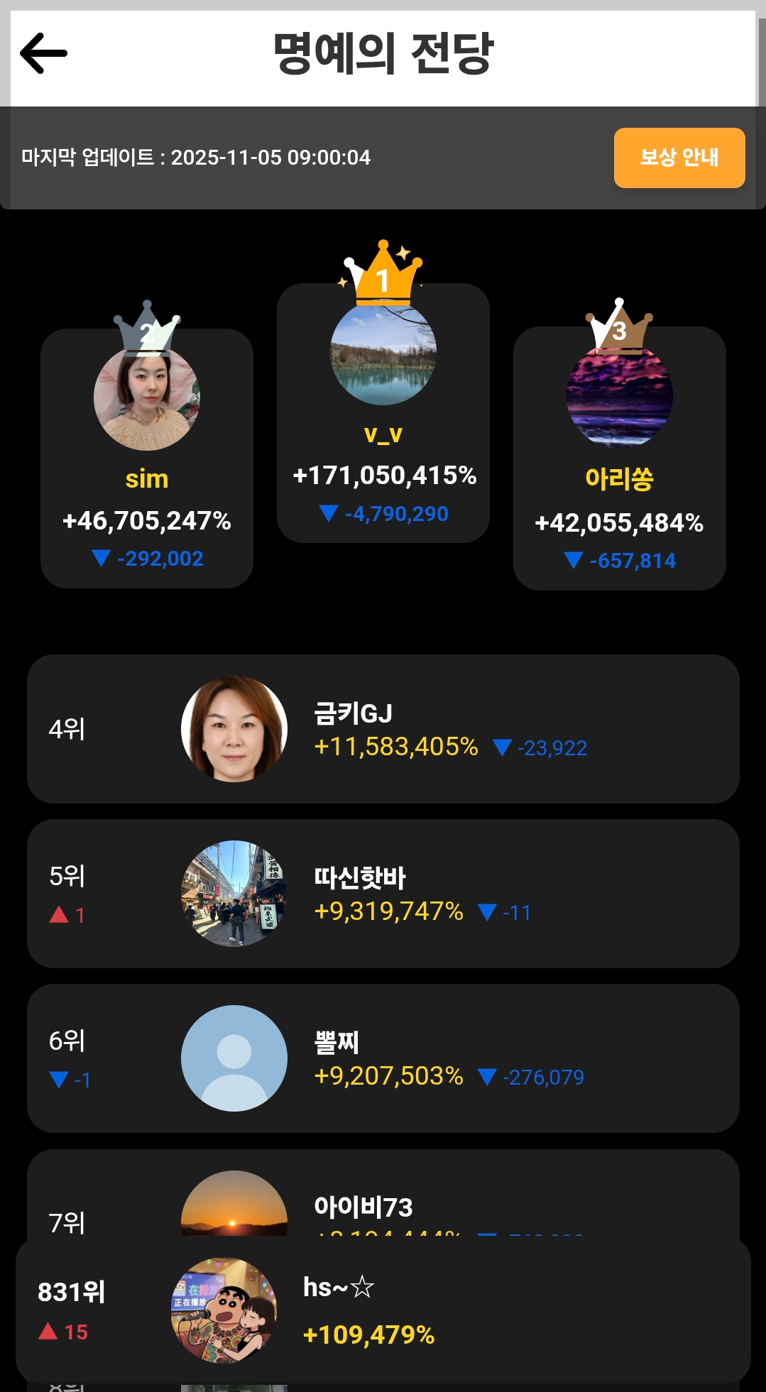 저도 현재 순위 831위 (+109,479%)까지 올라왔어요 😎
