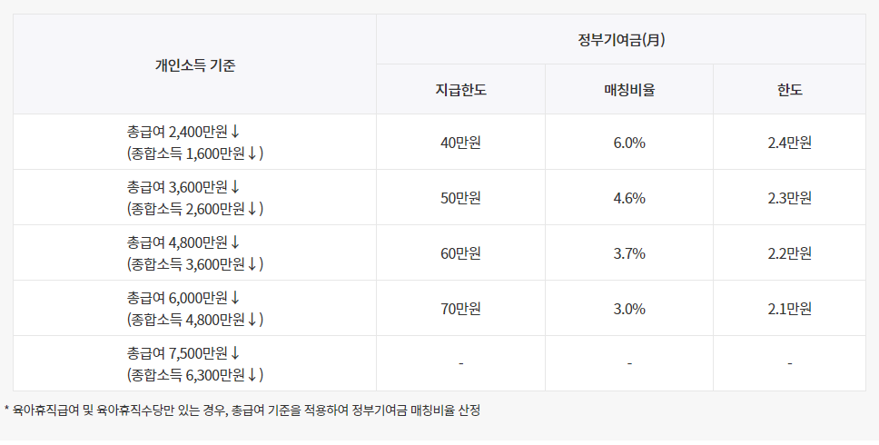 - 매월 정부 기여금 지원: 매월 최대 70만 원 예금 시, 정부가 10%~60% 매칭 기여금을 지원합니다. 예를 들어, 매월 70만 원을 가득 납입하면 최대 42만 원의 정부 기여금을 받을 수 있습니다.